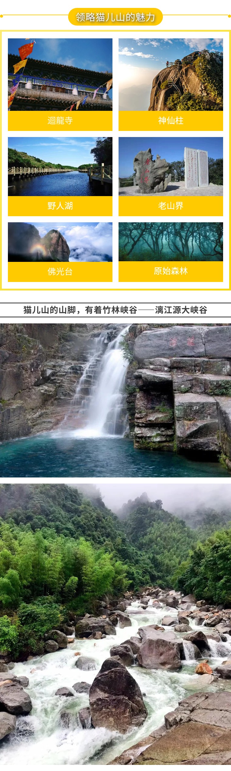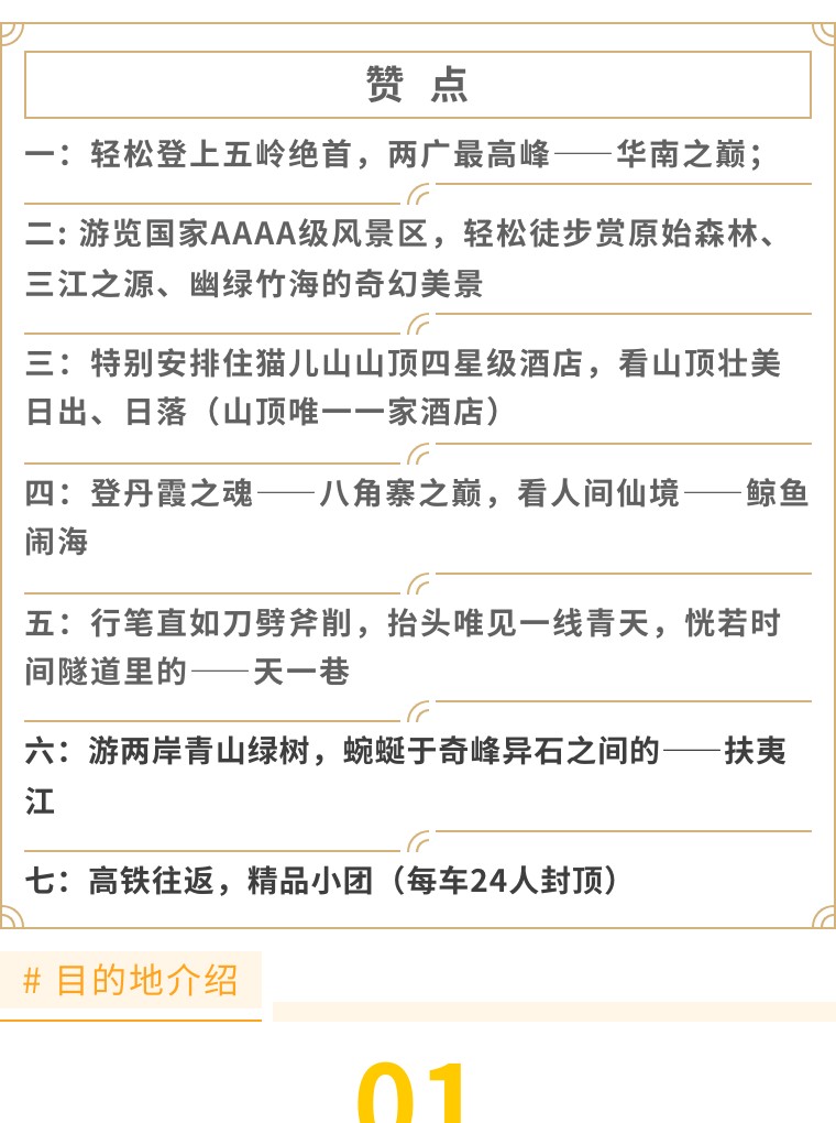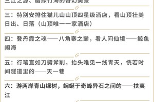 5、门 票: 猫儿山门票+景交车130元/人、漓江源大峡谷30元/人、崀山景区套票150元/人(含辣椒峰、骆驼峰、天下第一巷、夫夷江漂流、八角寨。单点不去无费可退);