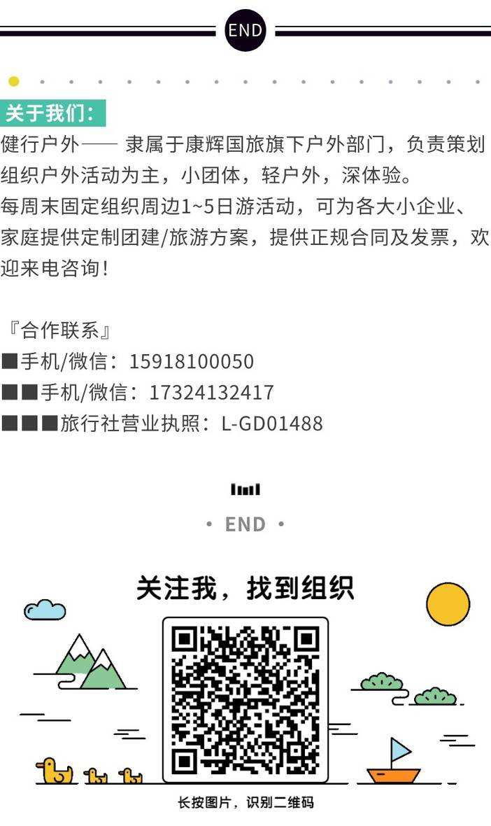 1. 报名前请确认自身身体健康,能完成本次行程,65岁以上老人报名请提供健康证证明,并签署免责协议,如在旅途中不幸染病,相关治疗费用及自身其它连带损失,将由出行人自身承担;未满18岁成年报名需成人陪同,本活动谢绝未报名的用户参加(含未报名婴幼儿)。为了他人健康及活动体验,本活动谢绝携带宠物参加。