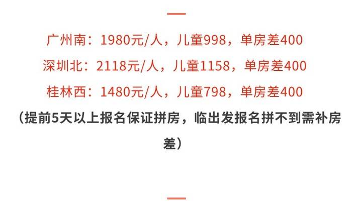 1、大交通: 广州南站/深圳北站——桂林西站(桂林北站) 往返动车+订票费;(如临近出发前才报名,无法保证一起报名的童鞋的位置在一起,请周知)