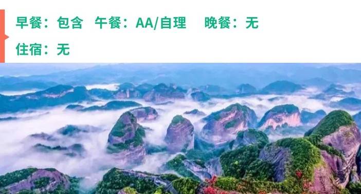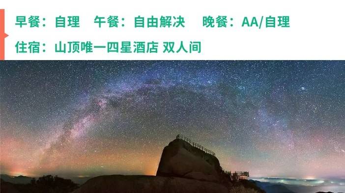 3、3晚住宿: 1晚猫儿山山顶四星酒店标间、2晚崀山精品客栈或酒店标间(单人报名安排同性拼房,提前5天以上报名保证拼房,不愿拼房请补房差400);
