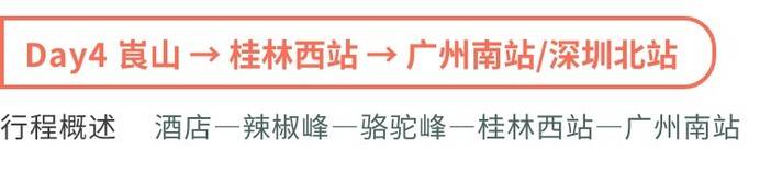 (深圳北站请自行乘车到广州南站中转高铁,车程约0.5小时,选择当地集合套餐的请在12:25前到达桂林西站);