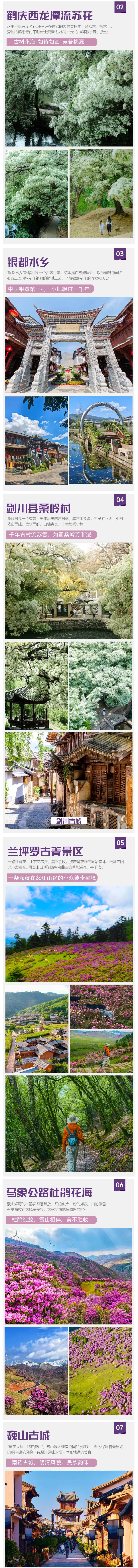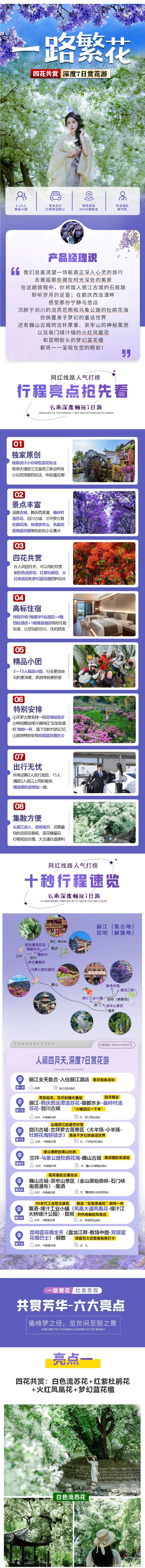 【景点丰富】:涵盖丽江古城、鹤庆西龙潭、桑岭村流苏花、剑川古城、兰坪罗古箐、马象公路杜鹃花海、巍山古城、秘境哀牢山、易门绿汁镇凤凰花、昆明蓝花楹等多个云南知名和小众景点。