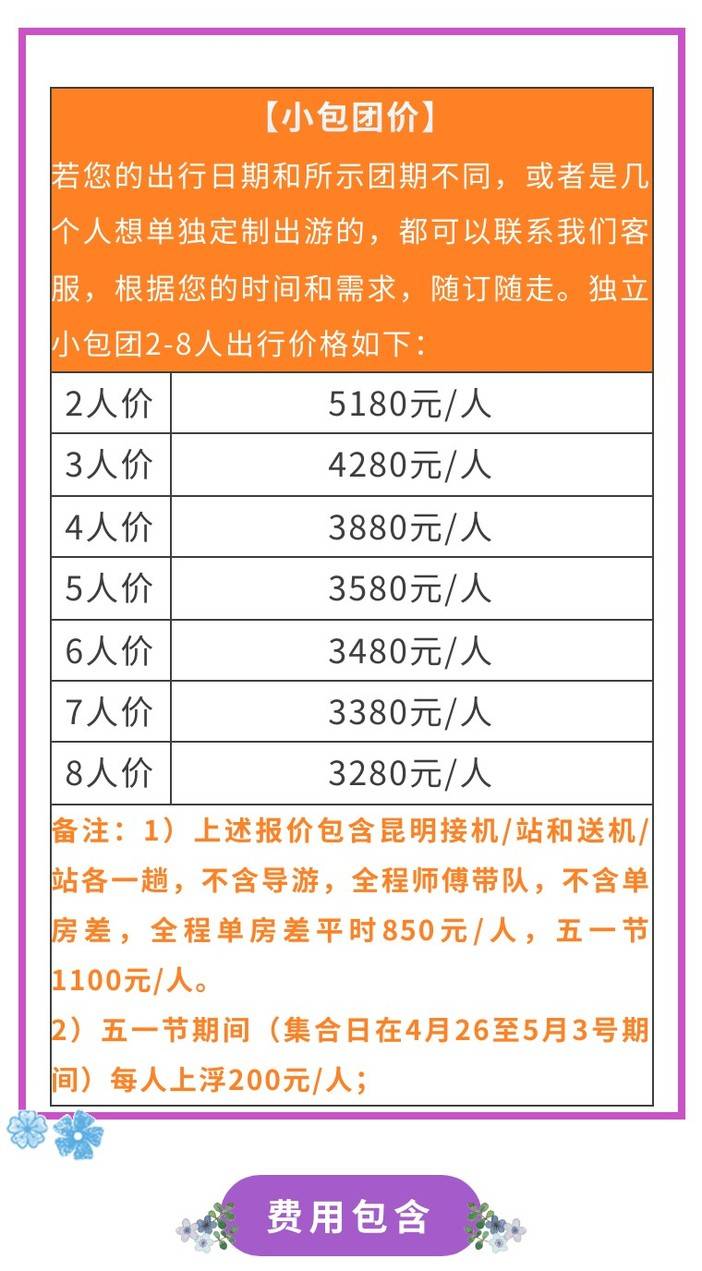 3、单人房差:行程住宿按照双人标准间安排,单人报名拼房不成,需补齐房差!平时850元,五一节1100元;