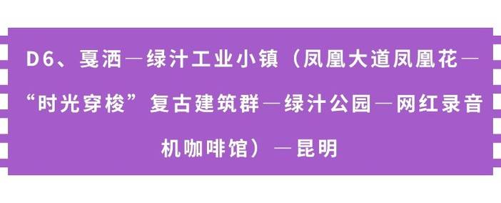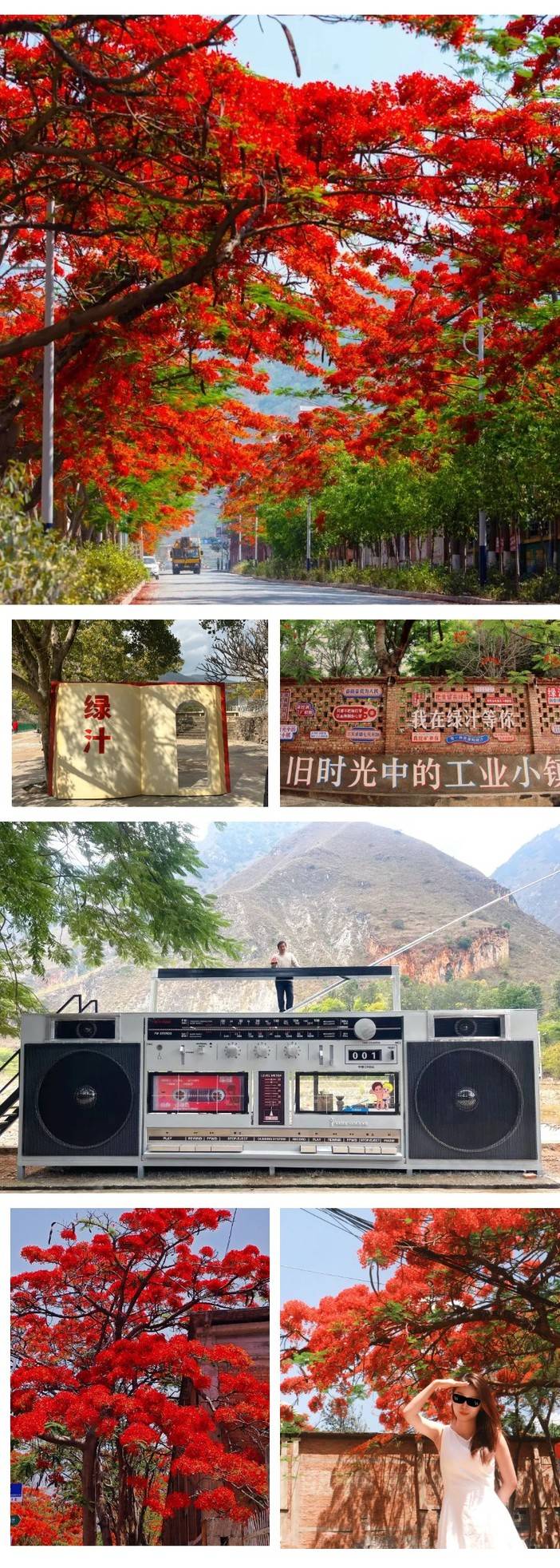 早餐后,沿着高速公路前行,路过绿汁江大桥,大约3小时车程就到达目的地—【绿汁工业小镇】。初夏美爆了云南除了蓝花楹,其实还有红花楹-凤凰花。 走进易门县绿汁小镇,一路凤凰花开,灿若云霞。2018年,绿汁电影院、苏联专家楼、木奔大桥被认定为易门县近现代重要史迹及代表性建筑。 2020年11月,易门铜矿被认定为第四批国家工业遗产。其实,即使没开花,这个80年代的工业小镇也非常值得一游。王鹤棣《黑夜告白》在这个小镇拍摄 陈翔六点半也来绿汁拍电影了。整个大半天,我们会游玩以下代表性打卡点:红砖房、绿汁电影院、苏联专家楼、新华书店、百货大楼、灯光球场、三矿工人俱乐部……是那个时代出生的人的共同记忆。来到这儿,时光仿佛凝固了一样,瞬间回到80年代,还是过去的样子。慢慢走,慢慢逛,我们还特别安排打卡网红10米大录音机巨型咖啡馆,赠送每人一杯“小绿汁”咖啡。