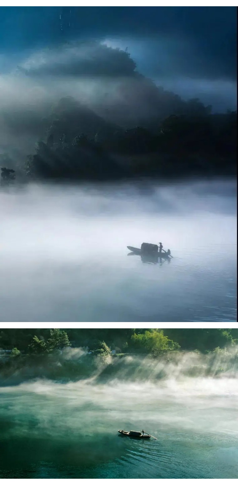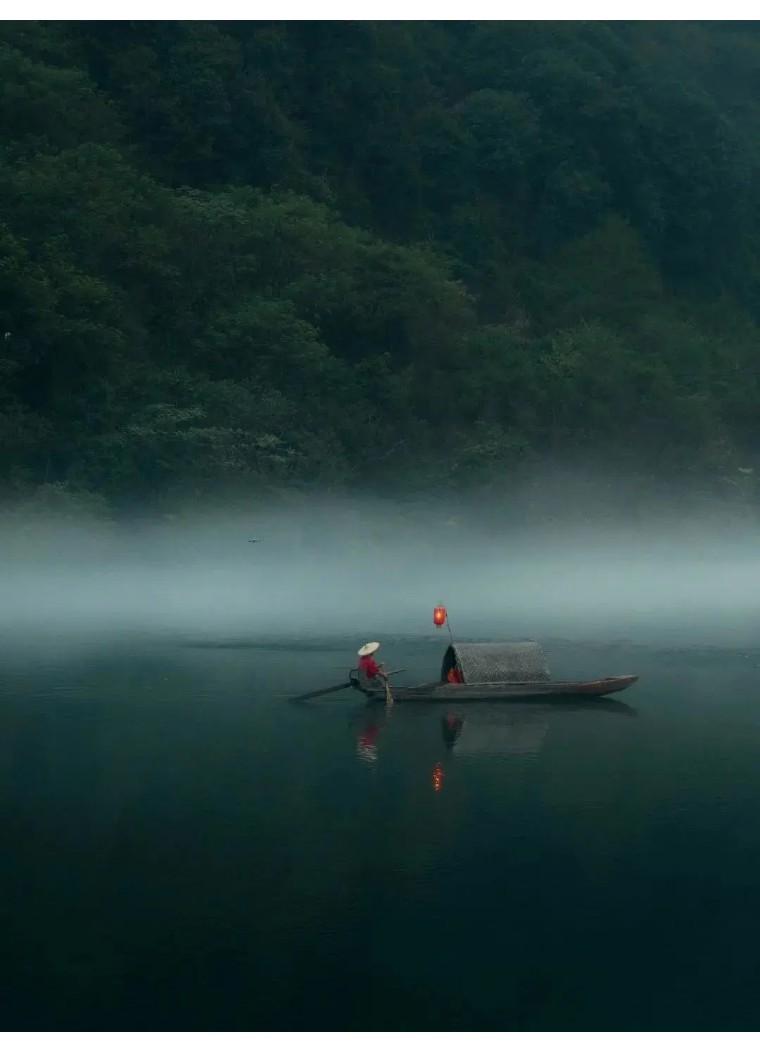 渔翁乘一叶扁舟,自雾中悠悠驶来