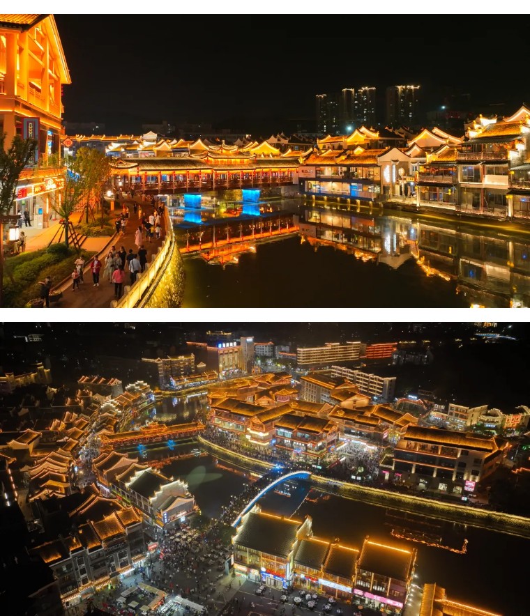 华灯初上,一江两岸的璀璨灯火映照在古桥流水