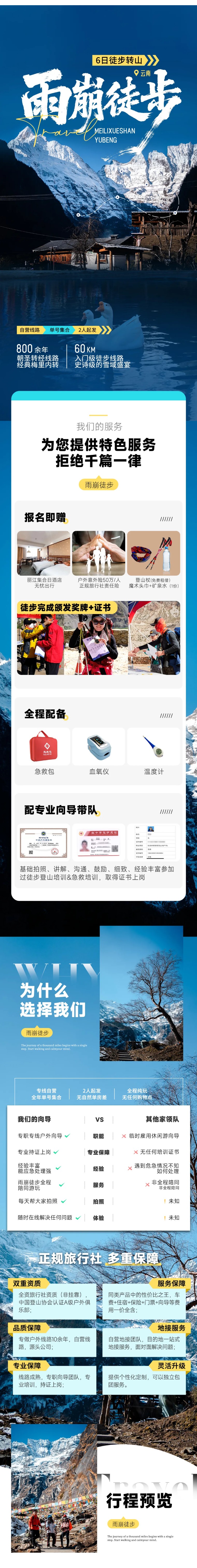 10、赠送说明:本行程免费赠送集合日丽江住宿(部分日期除外,详见费用说明处) 、提供雨衣登山杖证书奖牌各1份,不使用则无费用退还;