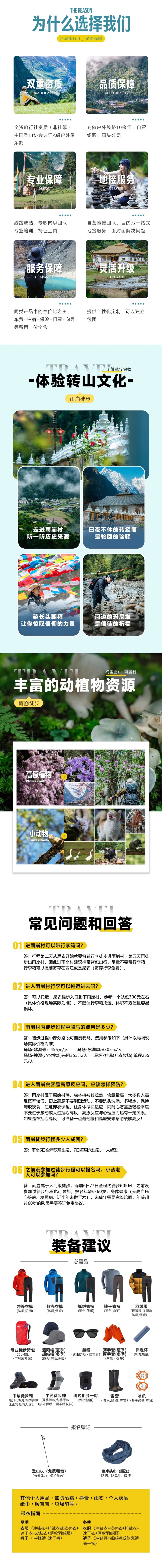 9、客观条件:本线路沿途经济水平较为落后,整体条件较差,例如飞来寺、雨崩村住宿条件较差,且停水、停电时有发生,阴天常无热水无法洗澡,请参与者提前做好心理准备;