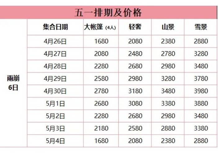 备注:以上价格仅区别雨崩村三晚住宿;丽江、飞来寺 住宿一致 。
