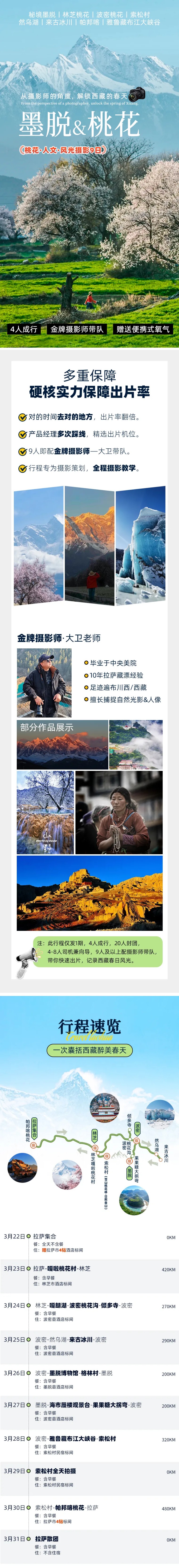 春季限定,3月22日拉萨(或3月23日林芝)集合,仅发1期,4人成行,20人封团。4-8人司机兼向导,9人及以上配摄影领队带队,带你快速出片,记录西藏春日风光。