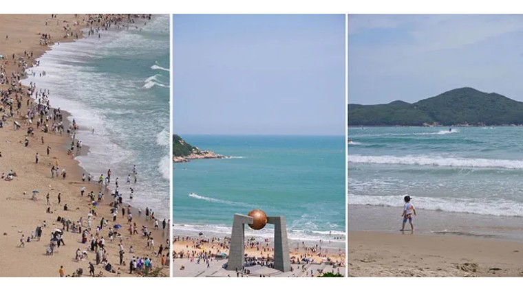 从高处俯瞰,青澳湾犹如一轮弯弯的新月。金黄柔软的沙湾绵延2400米,一直延伸到水下几百米之外。