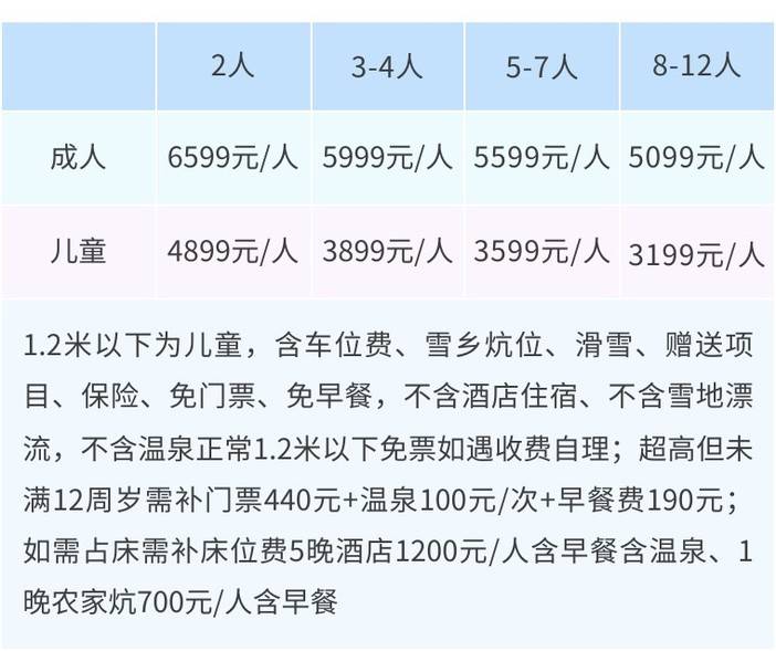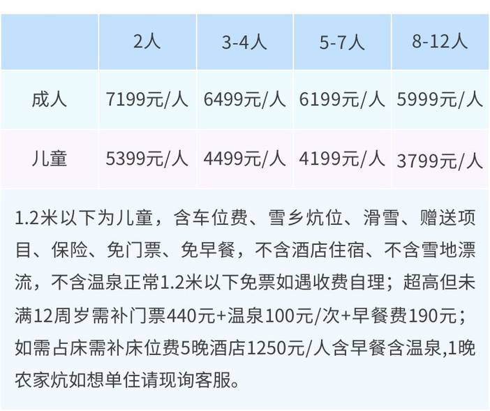 1.2米以下为儿童,含车位费、领队费、雪乡炕位、滑雪、赠送项目、保险、免门票、免早餐,不含酒店住宿、不含雪地漂流、不含温泉,正常1.2米以下免票如遇收费自理;超高但未满12周岁需补门票440元+温泉100元/次+早餐费190元;如需占床需补床位费含早餐含温泉,请参考单房差费用。