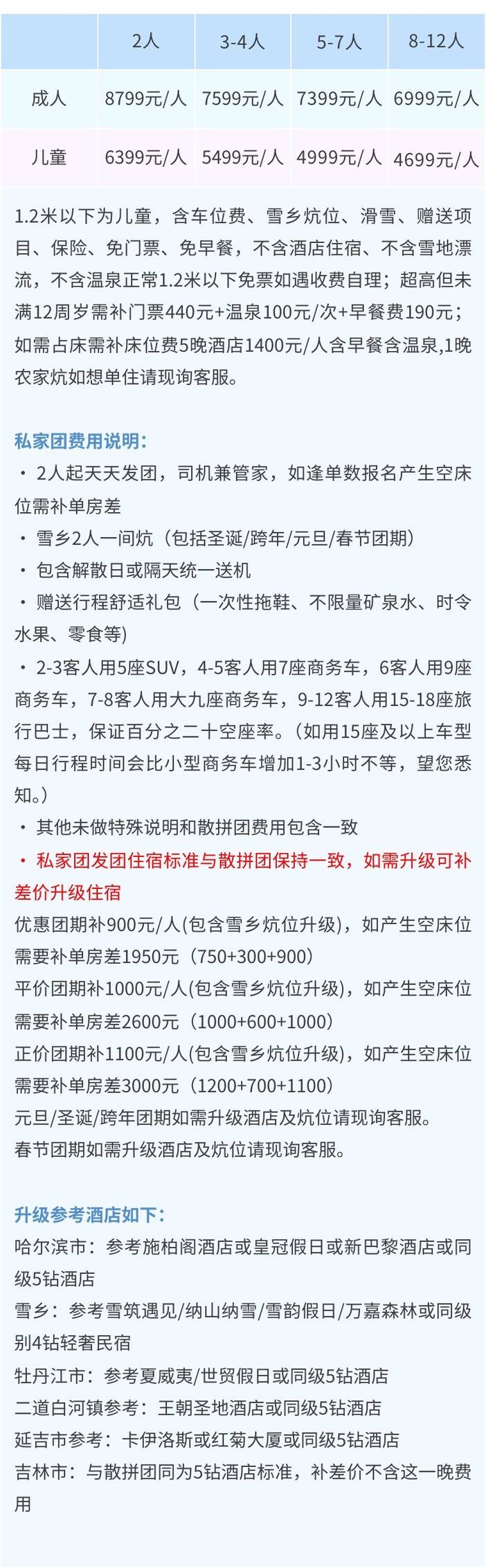 平价团期:5晚酒店 1000元/人、雪乡农家炕1人包炕补600元,2人包炕无需补差价。